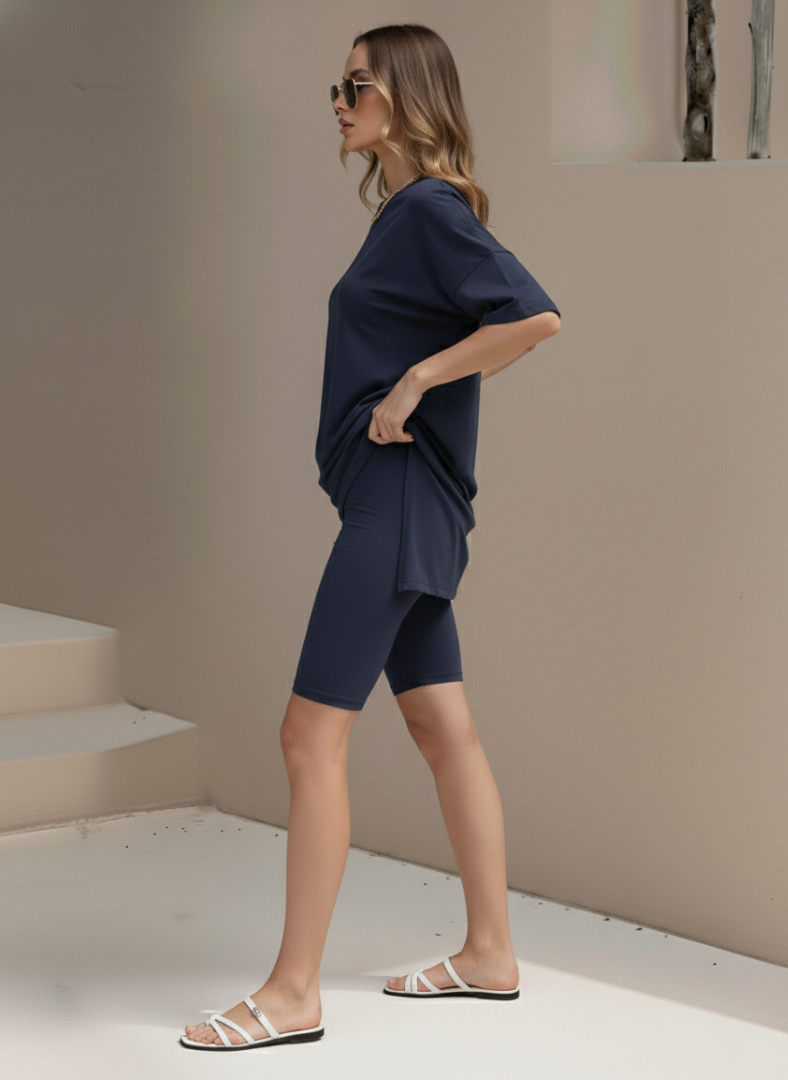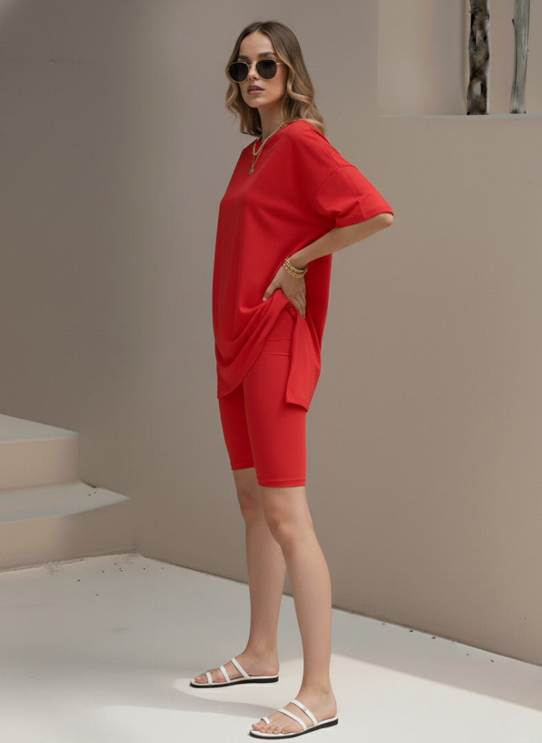 Chic and Trendy: The high-waisted biker shorts and oversized tee shirts offer a stylish and relaxed fit.