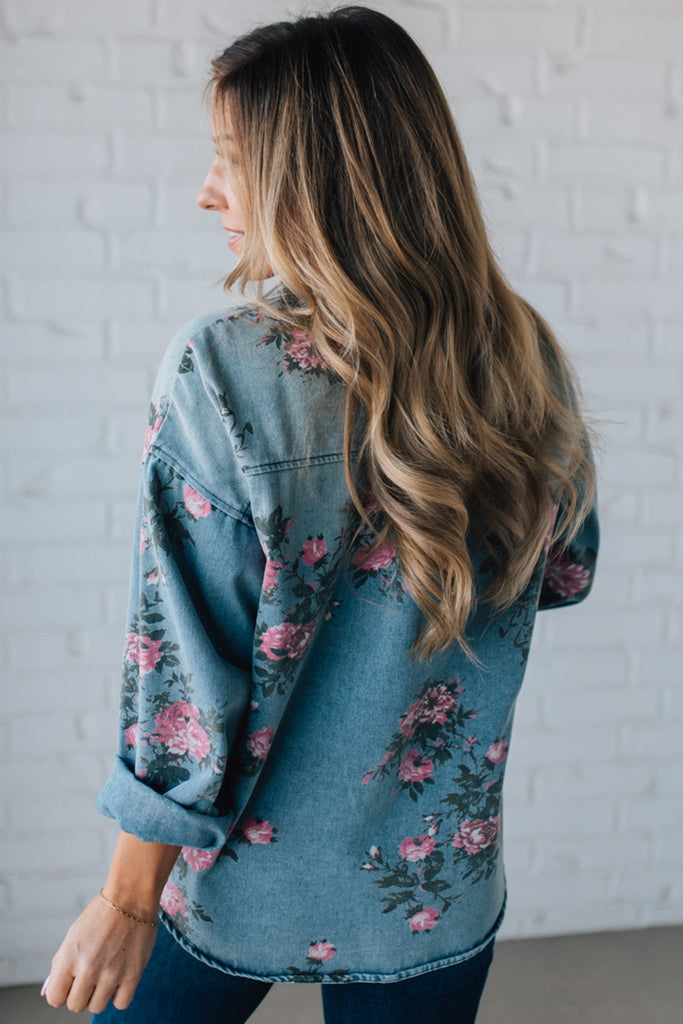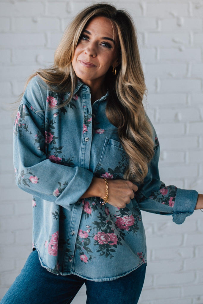 Add a dash of fun to your wardrobe with our Floral Print Denim Top. This playful and quirky shirt features a colorful flower print, and is made with lightweight denim fabric for comfort. With a button-up design, it's perfect for any casual occasion. (Seriously, who doesn't love a good floral print?)