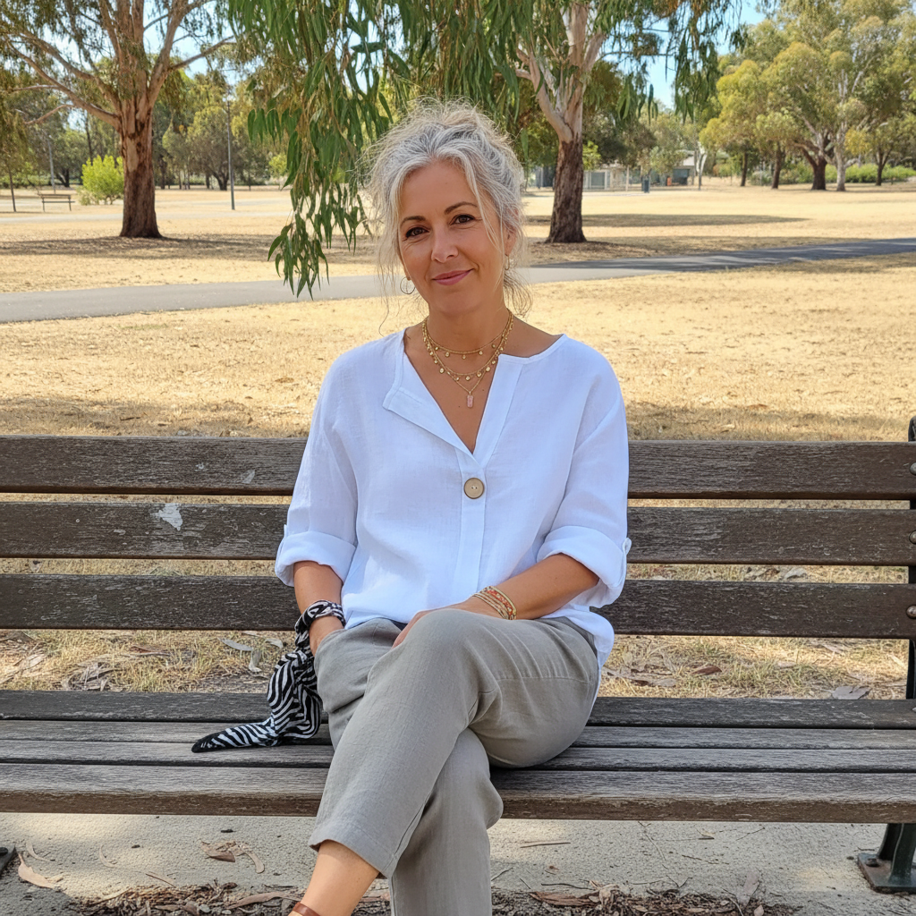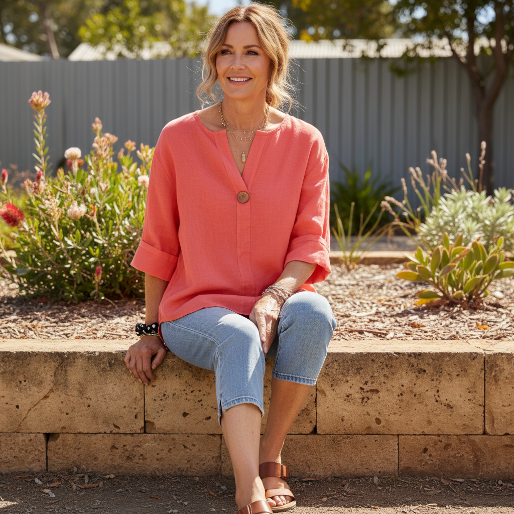 This blouse is perfect for creating effortless, put-together looks without feeling overdone. Style Luna with your favourite jeans and flats for a casual daytime outfit, or pair it with tailored trousers or a flowing skirt for a softly polished look. Its relaxed silhouette makes it an easy choice for everything from everyday errands to casual catch-ups.